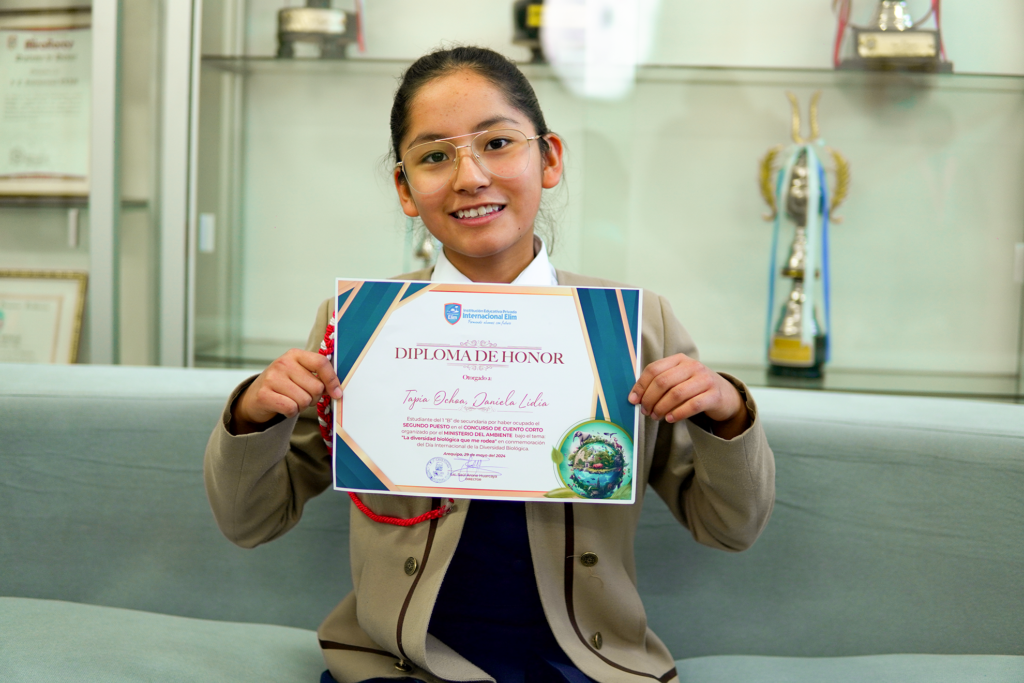 El Colegio Internacional Elim felicita con orgullo a nuestra alumna Daniela Lidia Tapia Ochoa, de 1° de secundaria, por haber alcanzado el segundo puesto a nivel nacional en el prestigioso Concurso de Cuento Corto, organizado por el Ministerio del Ambiente.